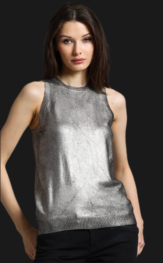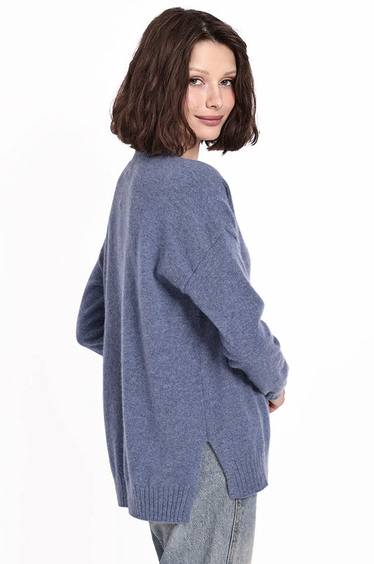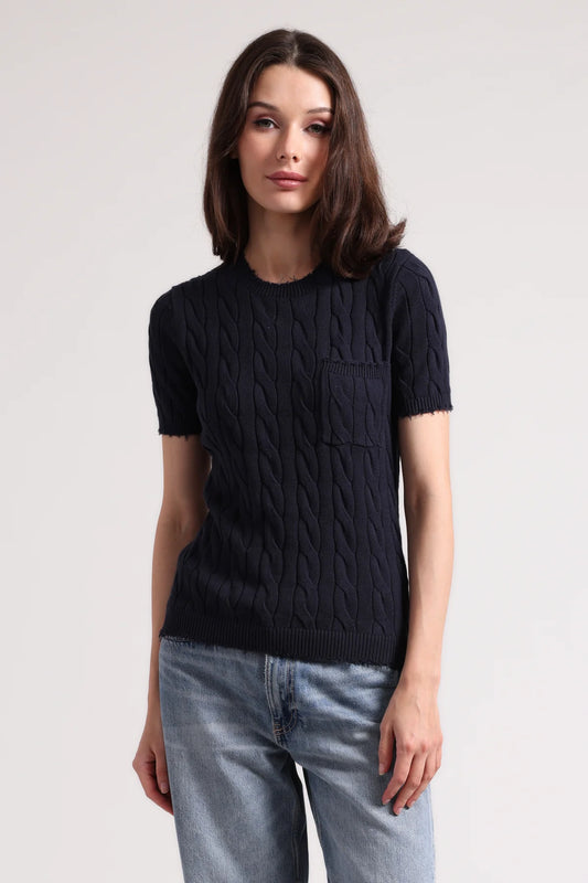 Cotton Frayed Cable Knit V-Neck Tee with Pocket