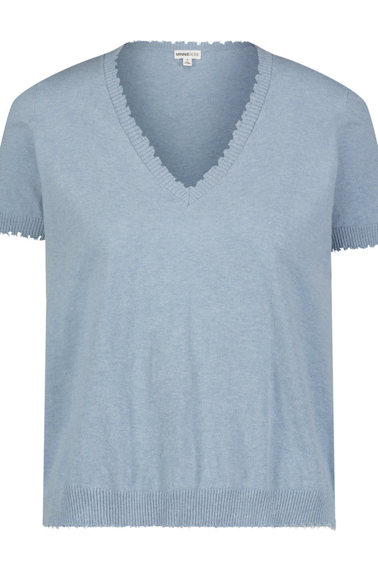 COTTON CASHMERE FRAYED V-NECK TEE- FRESCO BLUE
