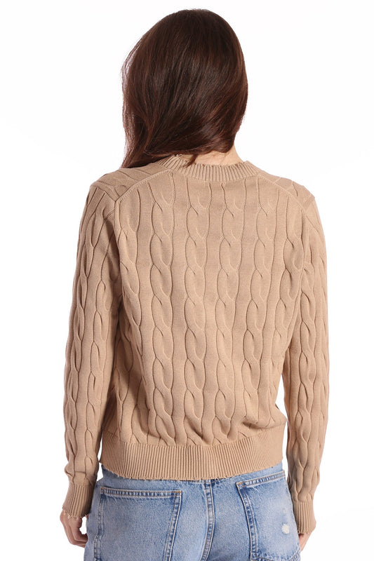 MINNIE ROSE COTTON CABLE LONG SLEEVE V-NECK WITH FRAYED EDGES